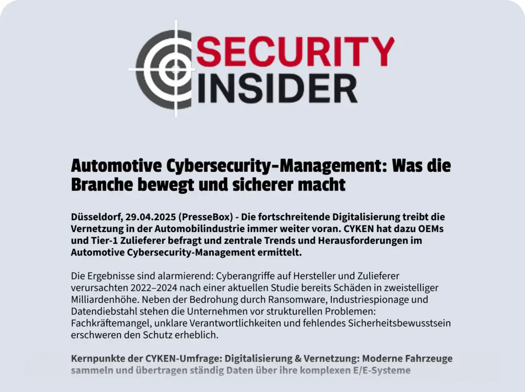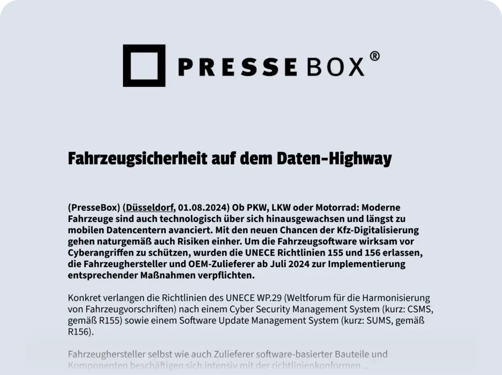 - Von OEM bis Zulieferer: Wir begleiten Sie bei CSMS, SUMS und Security Engineering. ISO/SAE 21434 & UNECE R155 compliance-ready – für sichere E/E-Architekturen und Lieferketten.
